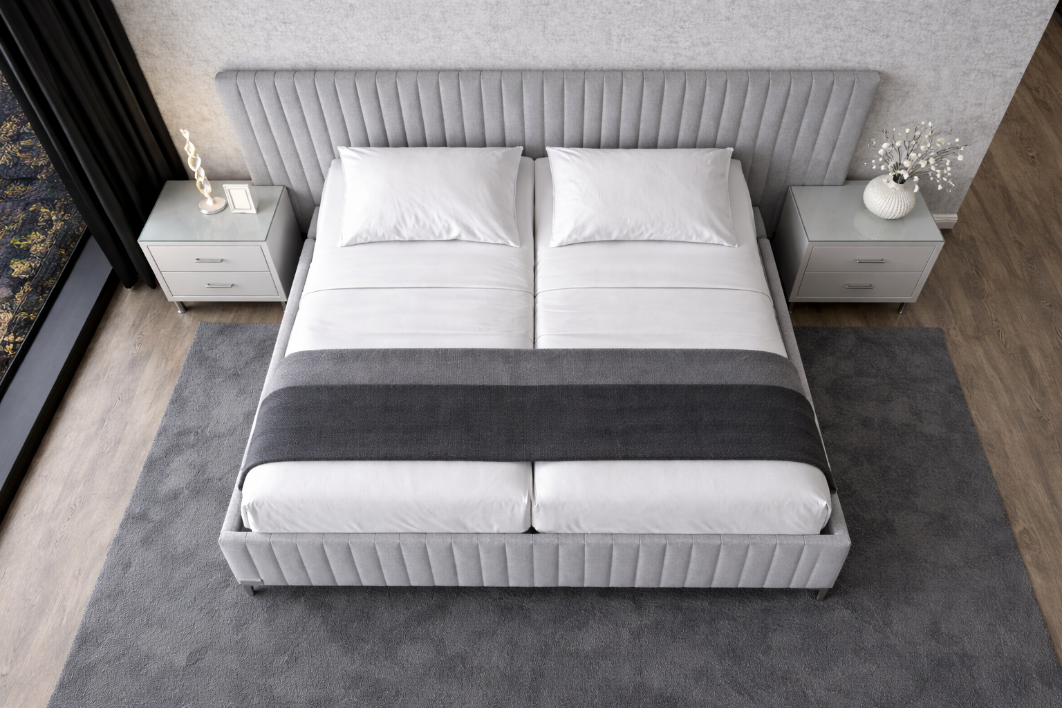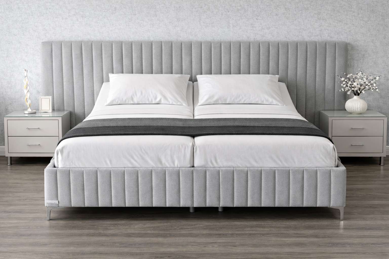 המיטה מעניקה לחדר השינה נוכחות מרשימה ועשירה, עם ראש מיטה רחב ודומיננטי, קווים אנכיים מדויקים ותחושת פרימיום בכל פרט, לצד אפשרות התאמה אישית מלאה למנח הגוף.