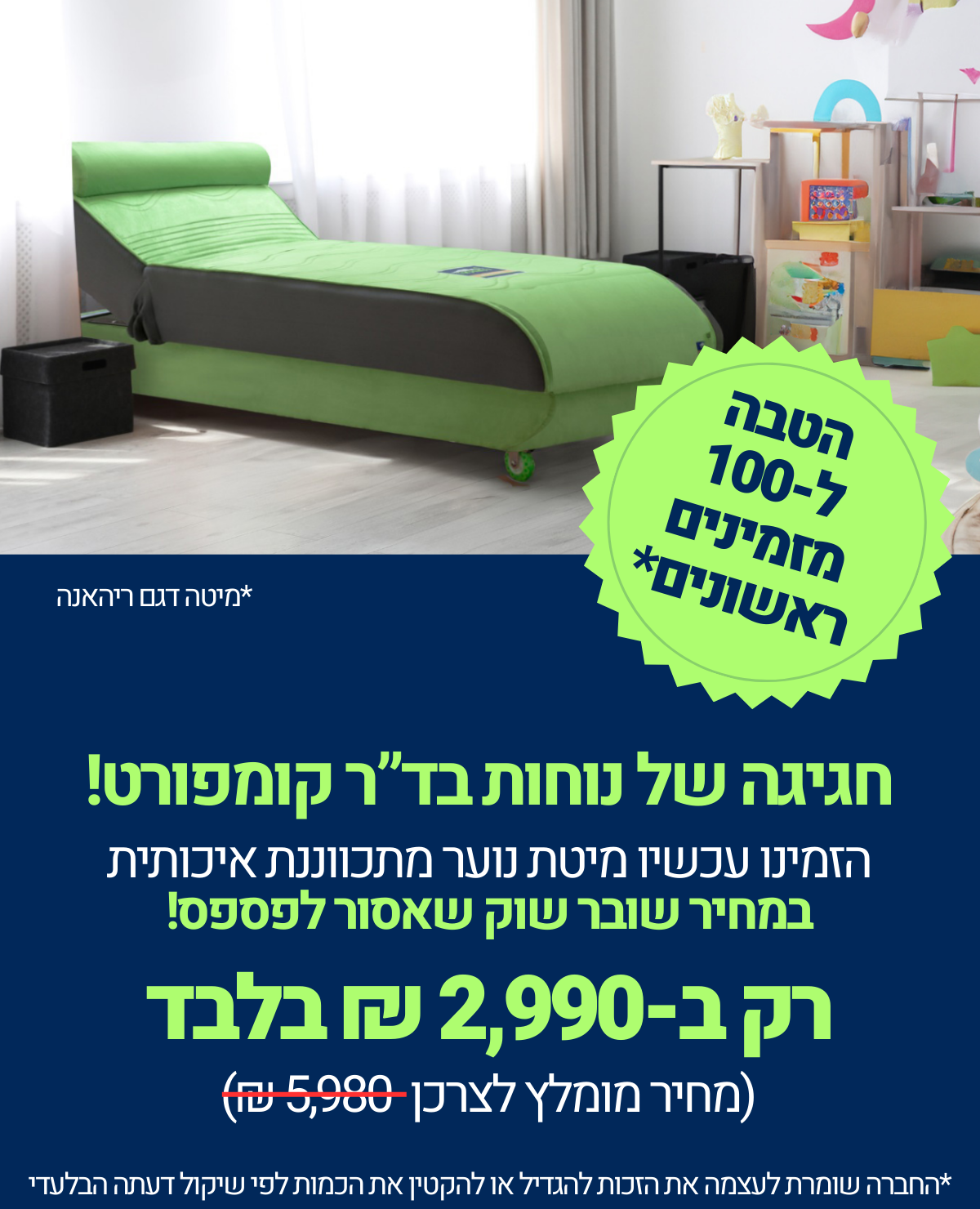 מיטות מתכווננות: מזרנים 12 שנות אחריות מלאה, למעט בד חיצוני, מעטפת מיטה שנה אחת  ומנגנון- 5 שנות אחריות מלאה, למעט נזק חיצוני או כתוצאה משימוש לא סביר.